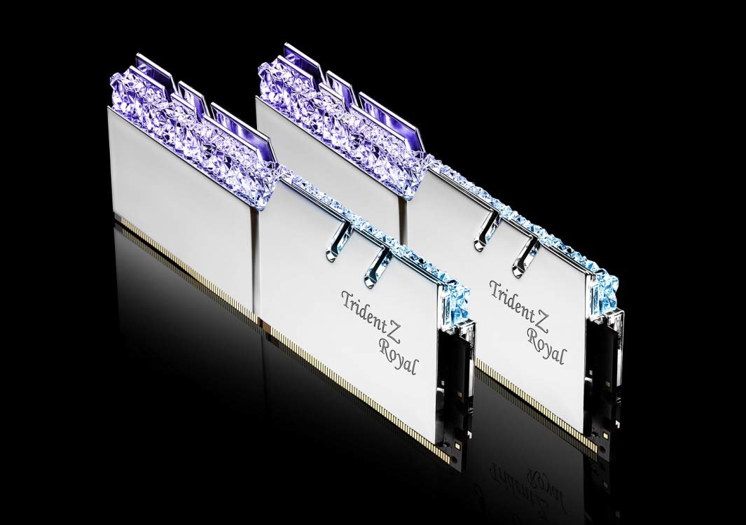 Trident Z Royal is the latest addition to the Trident Z flagship family and features a crown jewel design. Meticulously crafted to display just the right amount of light refraction, the crystalline light bar scatters the RGB colors in a magnificent display of LED lighting. Mirroring the high-class light bar design, polished aluminum heatspreaders of gold or silver colors cools the memory modules in the award-winning classic Trident Z tri-fin design. Radiant Diamond-like Top Bar The uniquely designed angular top bar of Trident Z Royal is crafted to disperse, refract, and reflect light. Combined with 8 controllable RGB zones, this memory kit will shine with or without the LED lighting enabled. Luxurious Polish A perfect fit in an all-metallic build, the Trident Z Royal memory is polished in a lustrous gold- or chrome-plated finish. Overclocking Prowess Tested for reliability, compatibly, and performance across a wide range of motherboards, each Trident Z Royal module is created with hand-screened memory ICs on a custom-engineered ten-layer PCB to ensure high signal integrity and great overclock ability. Software Controllable Controllable as a kit in sync or by individual modules, the Trident Z Royal lets you customize your own color scheme to the fullest extent. Let imagination be your muse. To fully control this next generation RGB memory, a new lighting control software is required and can be downloaded here. Asus Aura Sync Ready Want to sync up your system lighting Just use Asus Aura Software to personalize the colors and effects of your Trident Z Royal memory and Asus Aura-ready motherboard! XMP 2.0 Support Just set and go. Programmed with the latest Intel XMP2.0 profiles, the only thing between you and extreme performance is a simple setting. Specifications CAPACITY 32GB MEMORY SPEED 4000MHz STANDARD PC4-32000 SINGLE/DUAL/TRIPLE Dual Channel Kit CAS LATENCY CL19 MEMORY TIMINGS 19-19-19-39 VOLTAGE 1.35V ERROR CHECKING Non-ECC HEATSINK COLOR Silver REGISTERED Unbuffered TECHNOLOGY DDR4 SDRAM NUMBER OF PINS 288 pins CONFIGURATION Double-sided 16GB DDR4 modules, two modules per kit FEATURES 10-layer PCB With 8 controllable RGB zones PACKAGING Retail packaging